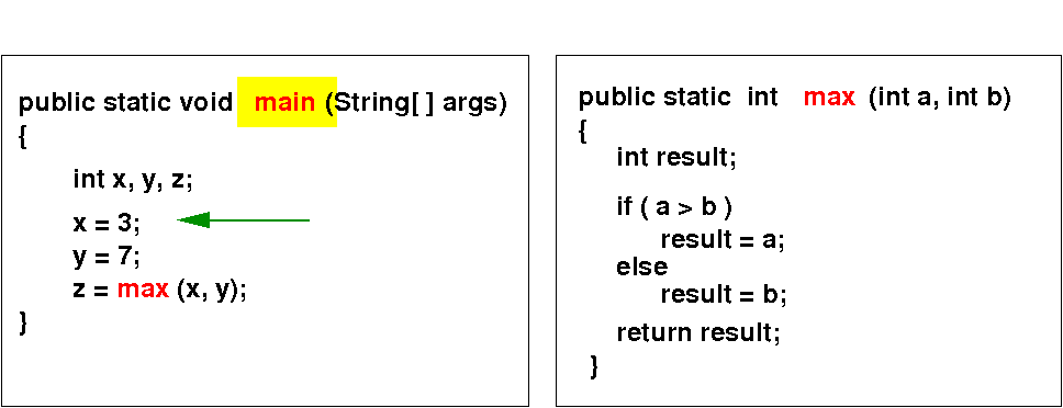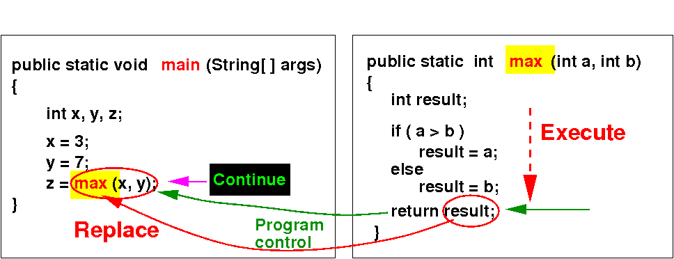 When the program invokes/calls the max( ) method, program control is transfered to the called method max:
