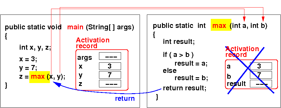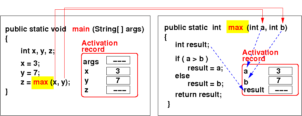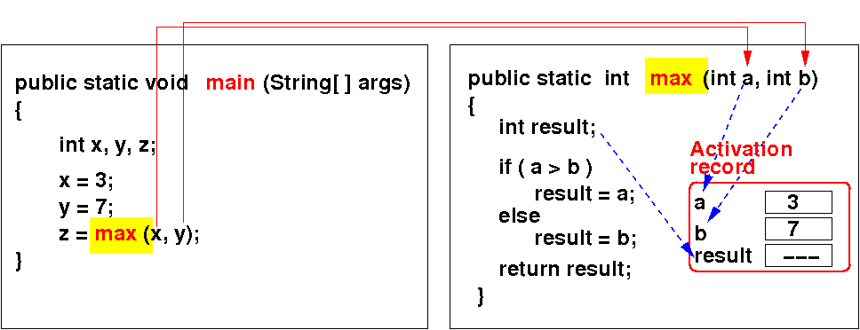 Each time a method is invoked, Java creates an activation record that stores parameters and variables: