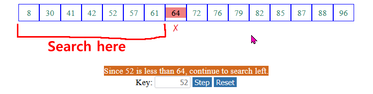 (3) If key < list[mid], we continue the search in the lower half of the array: