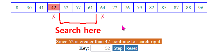 (4) Otherwise ( key > list[mid]), we continue the search in the upper half of the array:
