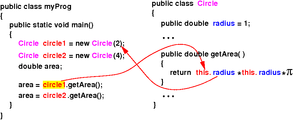 • When we invoke circle1.getArea(), the Java compiler will "secretly" pass circle1 as this to getArea():