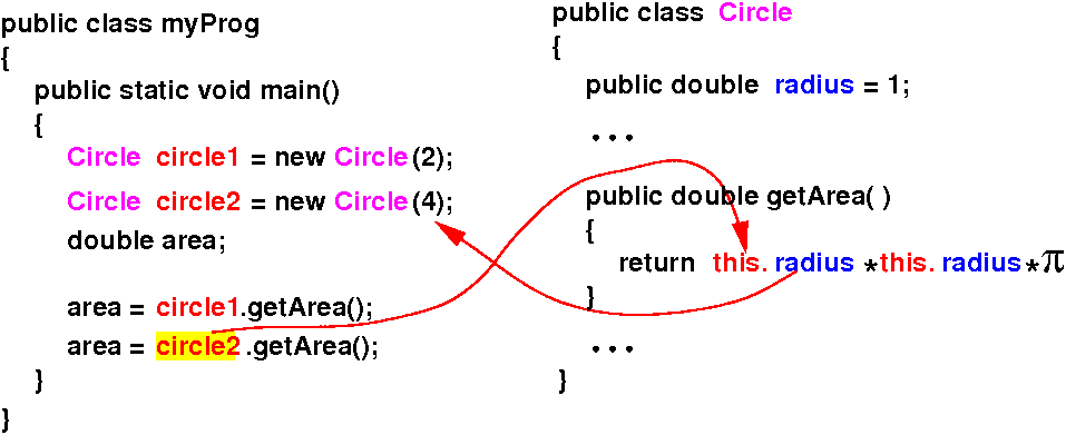 • And when we invoke circle2.getArea(), the Java compiler will "secretly" pass circle2 as this to getArea():