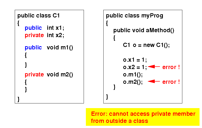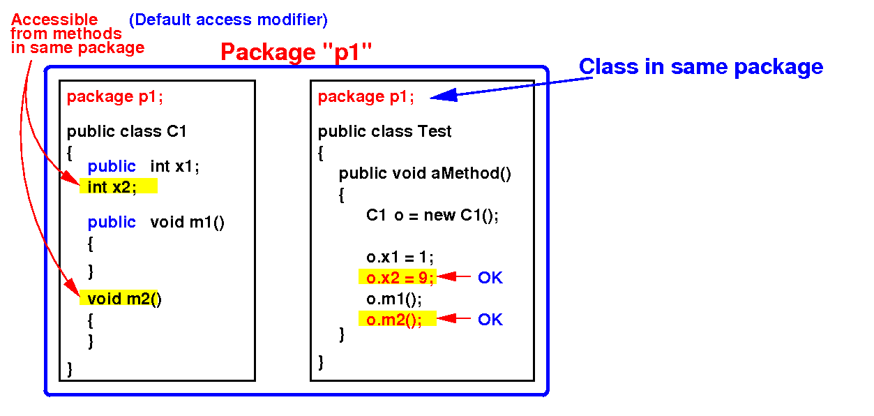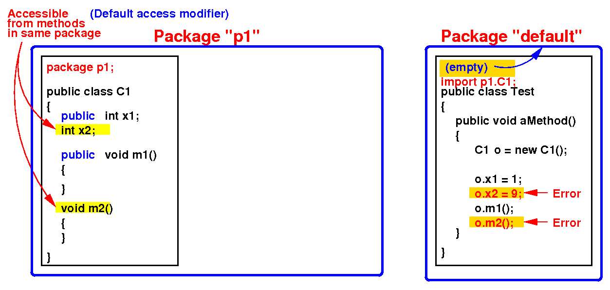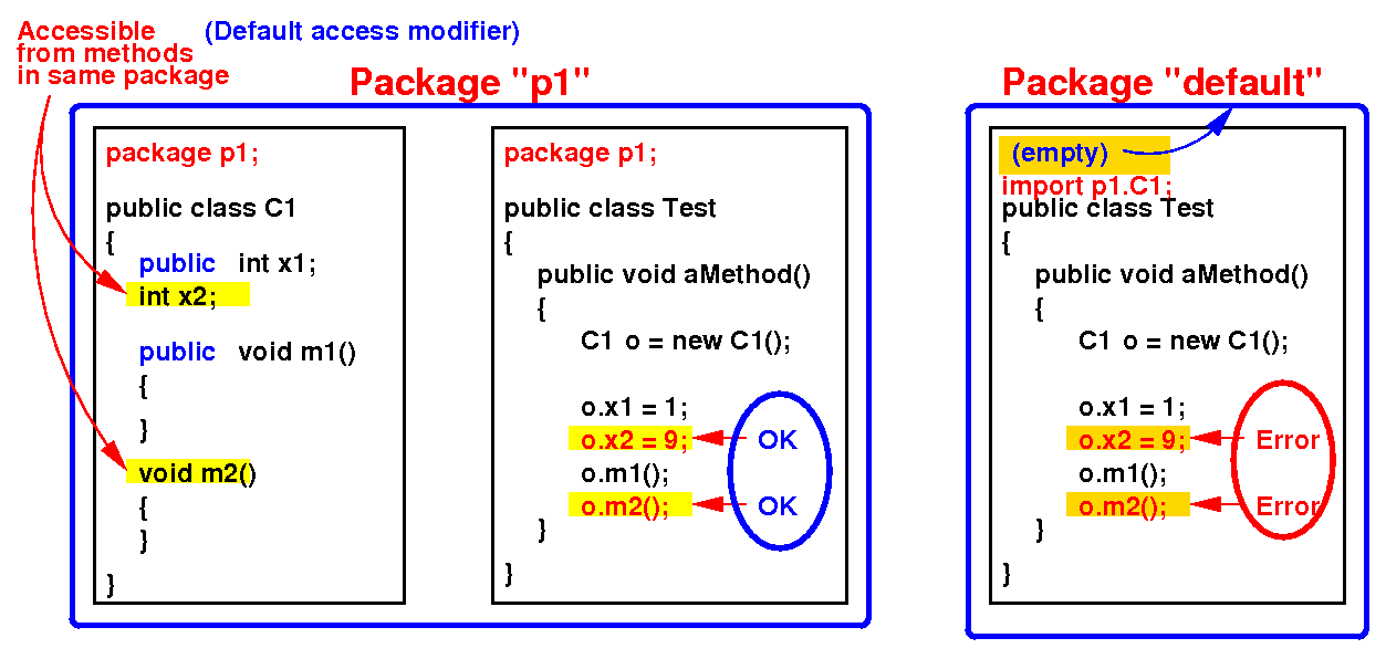 import p1.C1; public class myClass { void aMethod() { C1 o = new C1(); o.x1 = 1; o.x2 = 99; // Compile error o.m1(); o.m2(); // Compile error } }