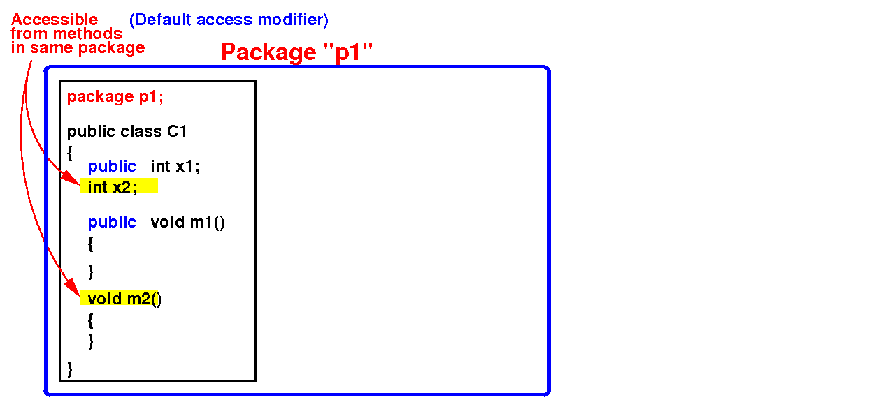 package p1; public class C2 { void aMethod() { C1 o = new C1(); o.x1 = 1; o.x2 = 99; // No compile error o.m1(); o.m2(); // No compile error } }