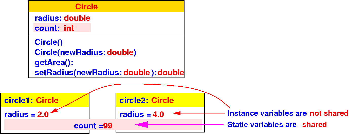 • How are instance variables and static variables of objects different: