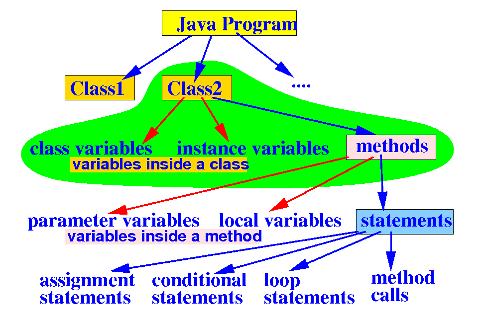 • A class in Java contains (1) variables and (2) methods