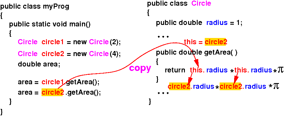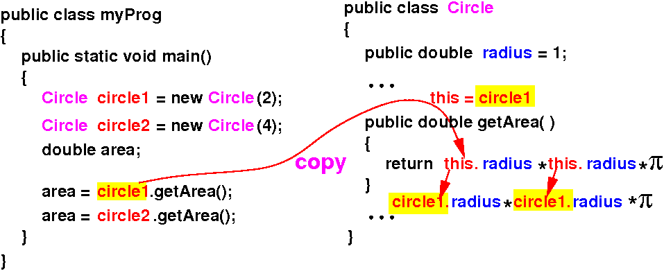 The parameter this is a copy of the reference variable in the method invocation (E.g.: circle1.getArea())