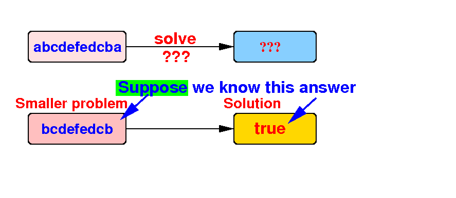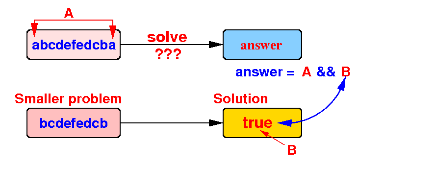 solution(orig problem) = w.charAt(0) == w.charAt(last) && solution(smaller prob)