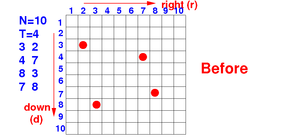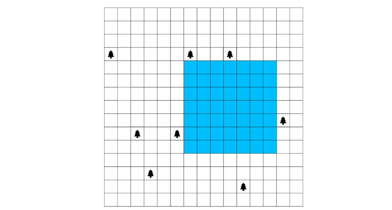 N = 10 // Grid size T = 4 // # Trees tree[0][0] = 3 tree[1][0] = 4 tree[2][0] = 8 tree[3][0] = 7 tree[0][1] = 2 tree[1][1] = 7 tree[1][1] = 3 tree[3][1] = 8 |