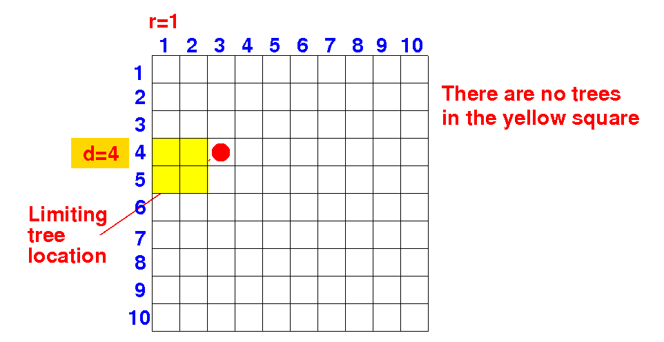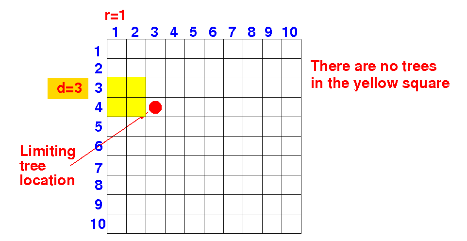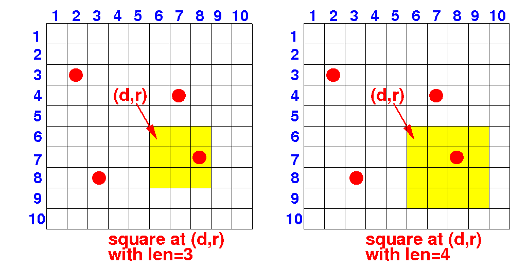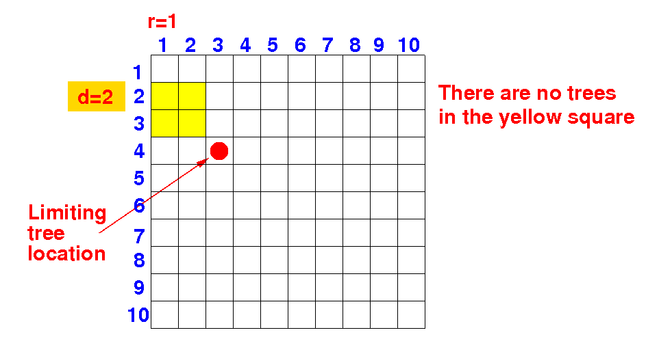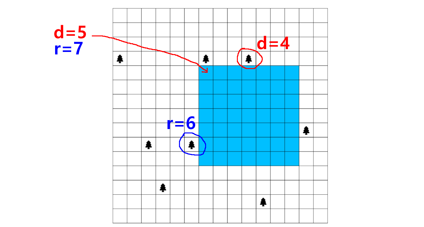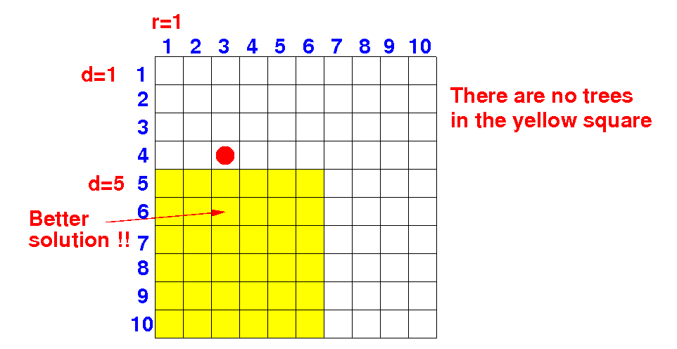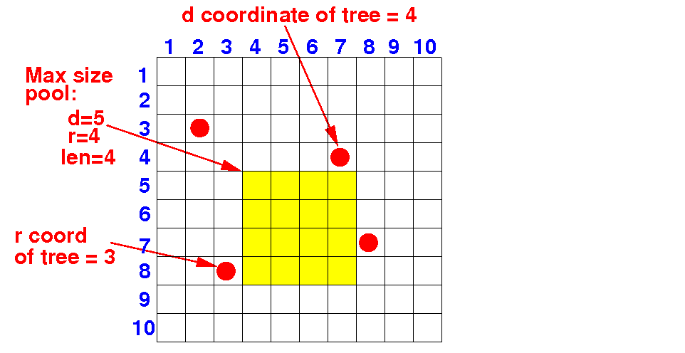 d_best = -1; r_best = -1; len_best = 0; for (d = 1, tree[0][0]+1, tree[1][0]+1, ...) for (r = 1, tree[0][1]+1, tree[1][1]+1, ...) { range = min( N-d+1, N-r+1); for (len = 1; len < range; len++) { // Check if there is a tree inside the pool isSolution = true; for (i = 0; i < T; i++) if ( tree i inside pool(d, r, len) ) { isSolution = false; break; } if ( isSolution ) if ( len > len_best ) { d_best = d; r_best = r; len_best = len; } } } |