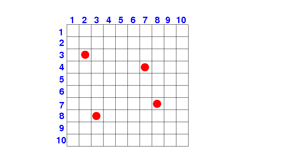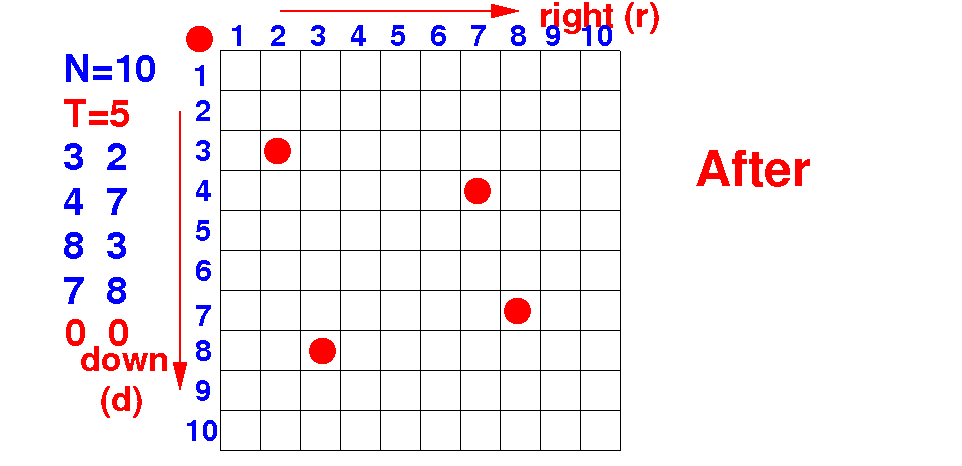 N = 10 // Grid size T = 5 // # Trees tree[0][0] = 0 tree[1][0] = 3 tree[2][0] = 4 tree[3][0] = 8 tree[4][0] = 7 tree[0][1] = 0 tree[1][1] = 2 tree[2][1] = 7 tree[3][1] = 3 tree[4][1] = 8 |