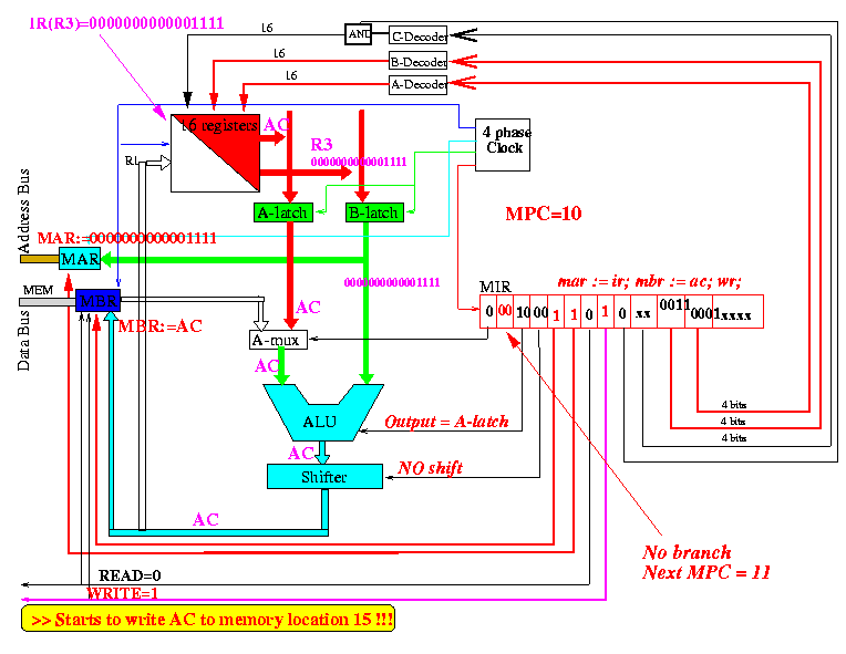 10: mar := ir; mbr := ac; wr; // data from AC register to memory at address