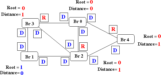 - Bridge 0: (id=0, root=0, dist=0)