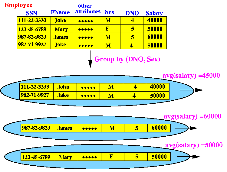 We must first form groups of employee tuples based on their DNO and sex attributes (grouped by department number and sex)